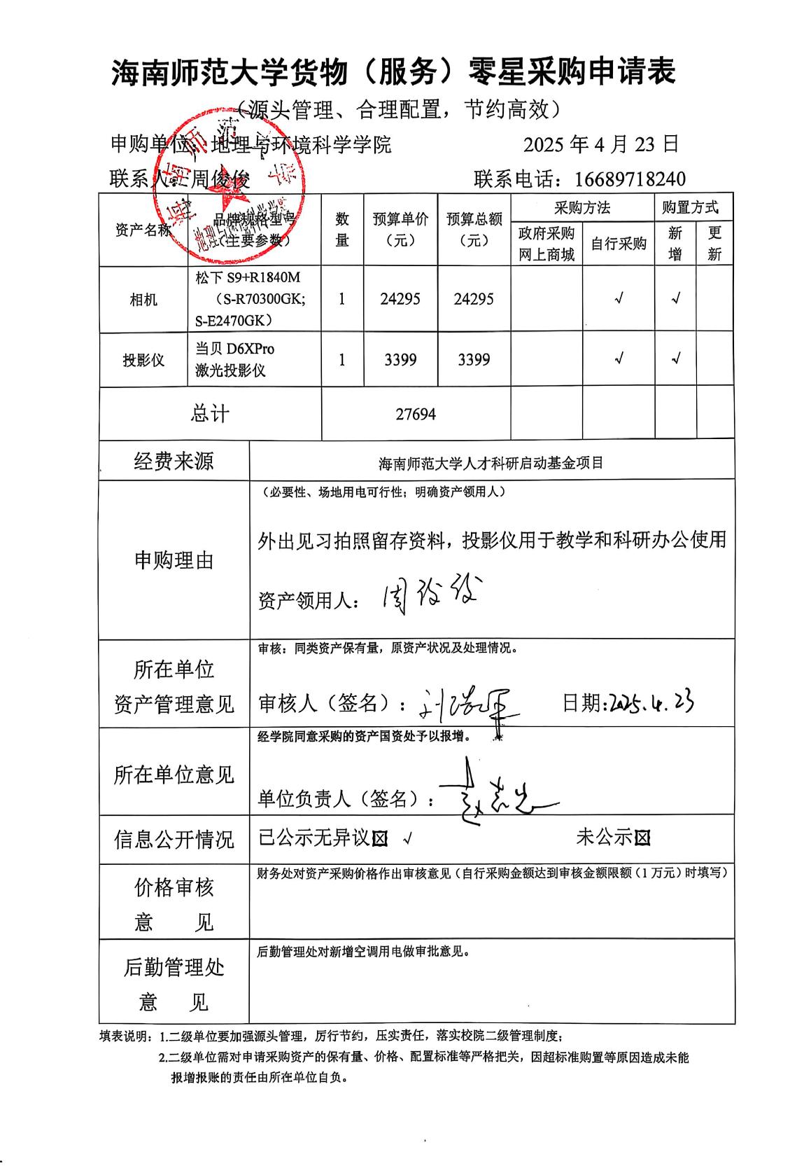 海南师范大学地理与环境科学学院周俊俊老师因教学科研工作需要,拟采购松下相机一台、当贝激光投影仪一台。现予以公示,公示期为2025年4月23日—2025年4月25日。