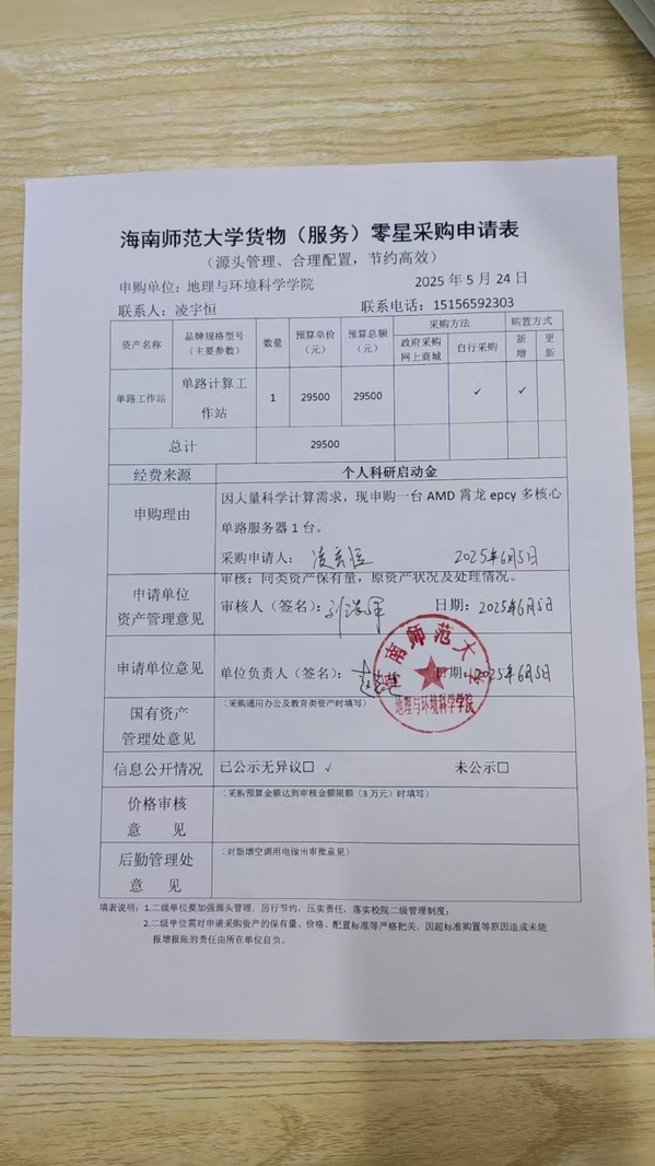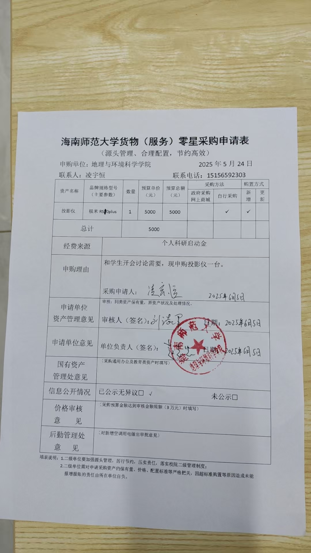 海南师范大学地理与环境科学学院凌宇恒老师因教学科研工作需要,拟采购单路计算工作站一台、极米投影仪一台。现予以公示,公示期为2025年6月6日—2025年6月10日。