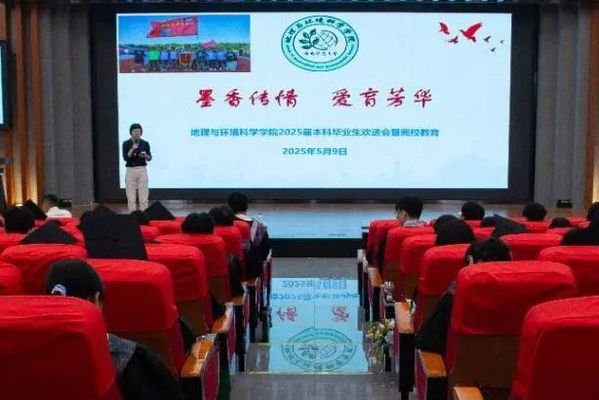 2025年5月9日,海南师范大学地理与环境科学学院2025届本科毕业生欢送会暨离校教育在图书馆报告厅举行。学院党委书记黄武,副处级辅导员李瑶老师,辅导员王宇翔老师,阮港老师及班主任代表杨艳丽老师出席会议,会议由王宇翔老师主持。