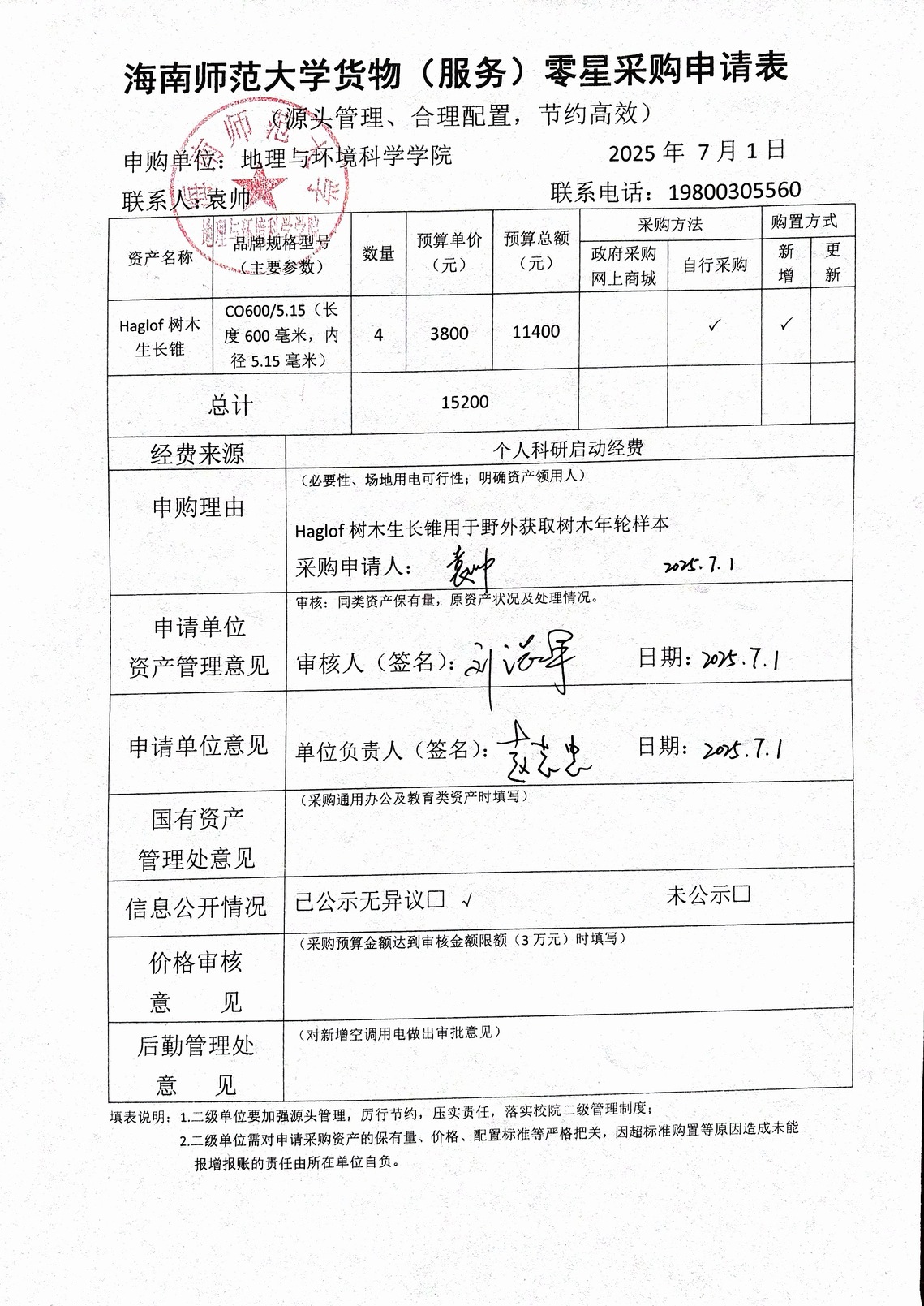 海南师范大学地理与环境科学学院袁帅老师因教学科研工作需要,拟采购Haglof树木生长锥4个,笔记本电脑一台。现予以公示,公示期为2025年7月1日—2025年7月3日。