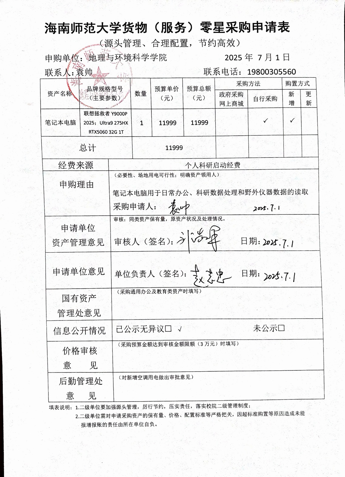 海南师范大学地理与环境科学学院袁帅老师设备 采购公示