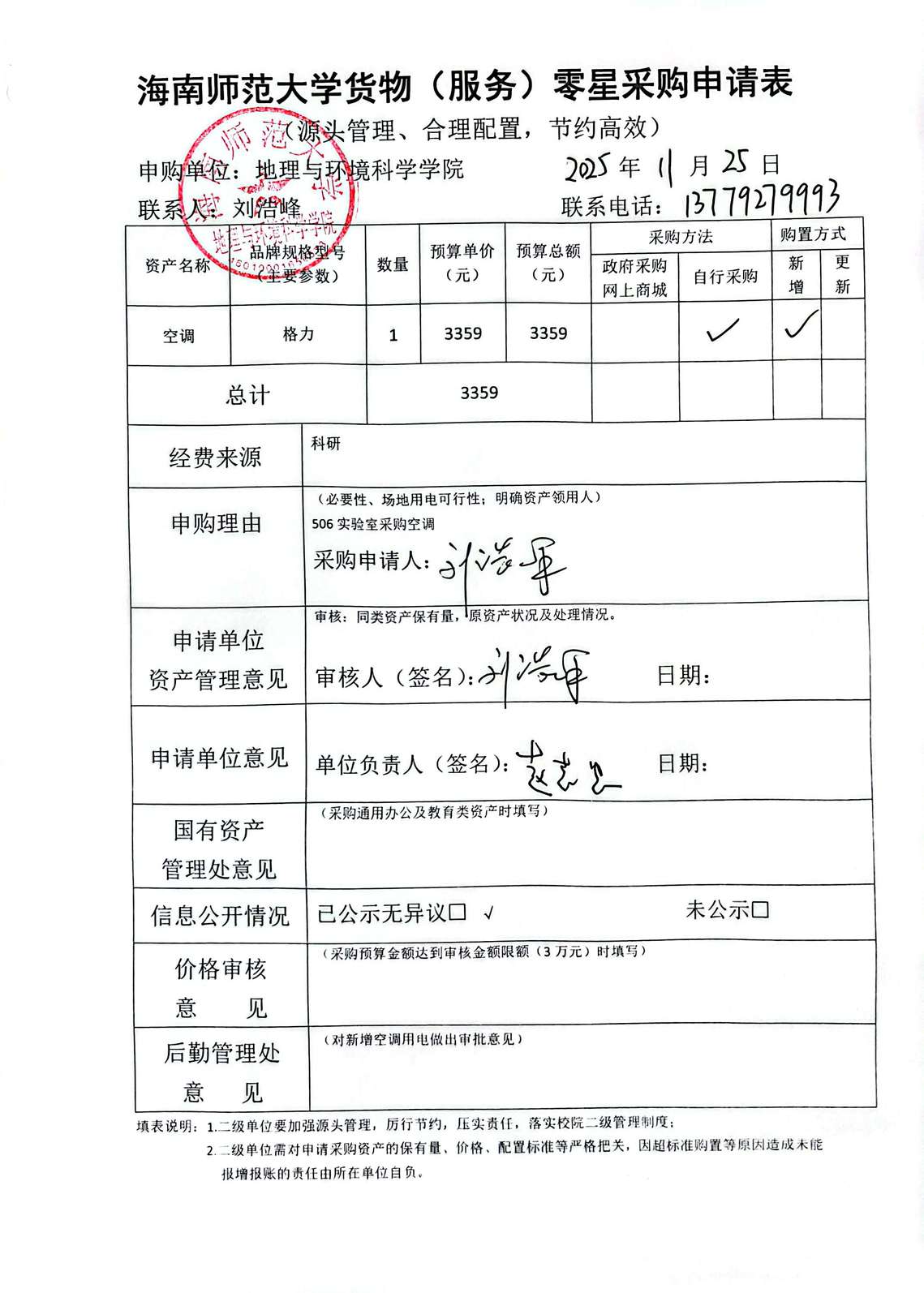 海南师范大学地理与环境科学学院刘浩峰老师因教学科研工作需要,拟采购格力空调一台。现予以公示,公示期为2025年11月26日—2025年11月28日。