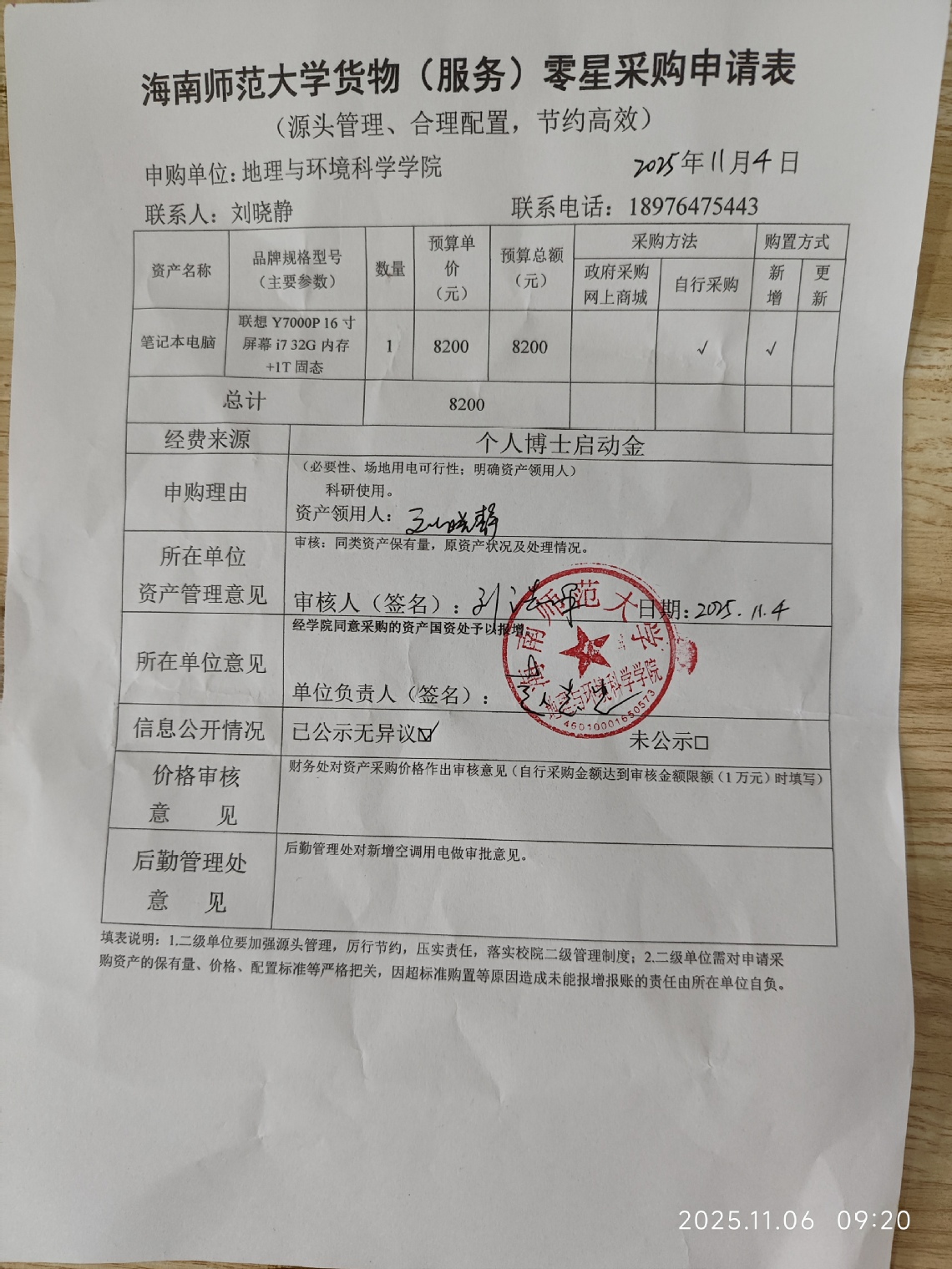 海南师范大学地理与环境科学学院刘晓静老师设备采购公示