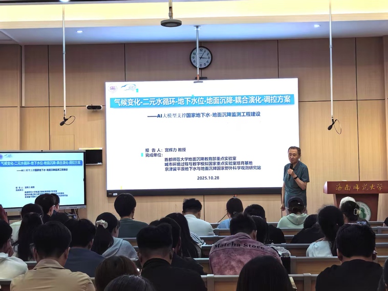 2025年10月28日下午,地理与环境科学学院特邀首都师范大学原校长、博士生导师宫辉力教授举行了题为“气候变化-二元水循环-地下水位-地面沉降-耦合演化-调控方案--AI大模型支撑国家地下水-地面沉降监测工程建设”的讲座。邱彭华副院长主持了讲座,学院180多位师生参加了此次学术交流活动。
